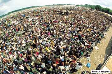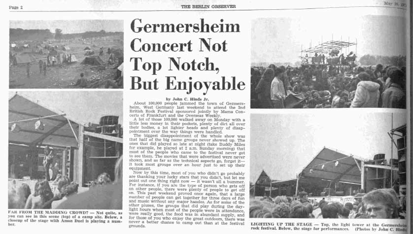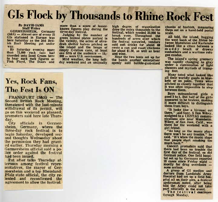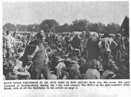 By Saturday evening more than 72,000 - rock fans had crowded onto Insel Gruen... All told, the island, hugging the west bank of the Rhine between Mannheim and Karlsruhe looked like a cross between a muddy beach of drowsy sunbathers and a wartime refugee exodus...(read more)-- David Iams, Stars & Stripes (*Thanks to Timothy Boss for sending this article and ticket stub!)