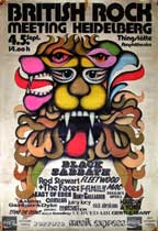The second British Rock Meeting was suppose to take place on Friesenheimer Island in Mannheim, Germany; however, the Mannheim city council opposed it and MAMA Concerts had to change the venue. The early posters still show Mannheim as the festival location. As can be seen on the left, the original poster was done in blue, with Mannheim as the venue, new posters were printed in red after the promoters found an alternate site to hold the festival. MAMA Concerts first tried to relocate the festival to Korsika and then to the racetrack in Hockenheim but strong reaction from the city councils made these sites unacceptable.