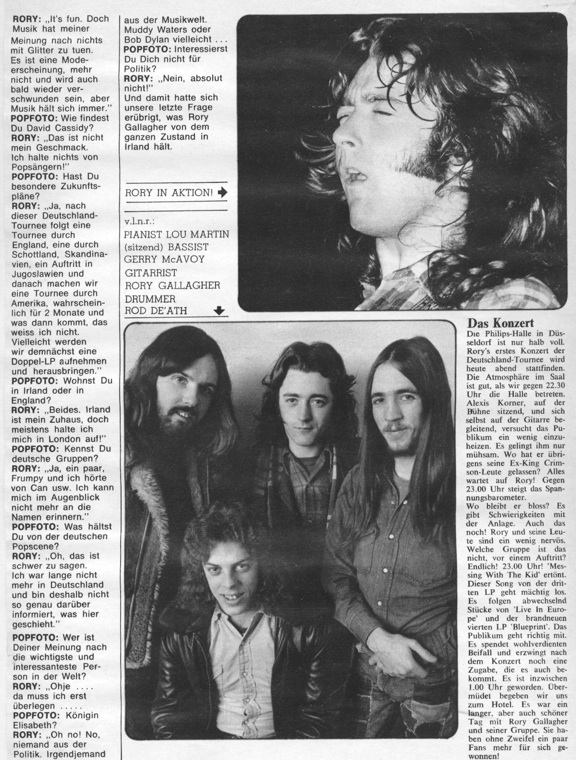 The following is a translation of a Rory Gallagher interview published in the March 1973 German edition of Popfoto Magazine. Brigitte Lehmann, former journalist/photographer for the pop magazine, Popfoto, conducted the interview on January 12, 1973, in Düsseldorf, Germany. Rory is set to start a tour of Germany with new drummer Rod De’ath and keyboardist Lou Martin and his first show is at the Philipshalle in Düsseldorf with Alexis Korner as supporting act. Included in the Popfoto article is a review of the Philipshalle concert as well as a short biography of Rory. Click on the thumbnail pictures below to see scans of the original Popfoto article.